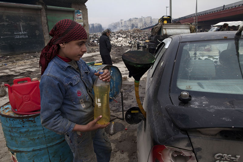 Hay barrios de la ciudad que están totalmente destruidos, tierra de nadie entre el fuego cruzado de los francotiradores. En otras partes, algunos comercios han vuelto a abrir sus puertas, pero la mayoría de productos se compran en la calle al triple de su valor; los hay que vienen de Turquía y otros son de contrabando, como el tabaco o la gasolina.