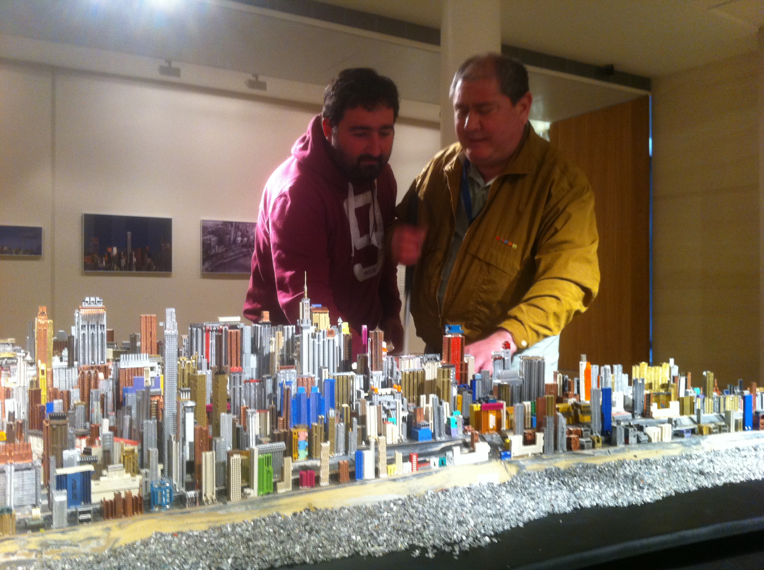 “A las personas ciegas totales hay que decirles a tu derecha, a tu izquierda, al frente o a tu espalda, y no decir ahí, porque usáis mucho los términos visuales”. Es la cantinela que Armando Castellanos García esgrime cuando Sebastián Román le describe las piezas que componen la maqueta, la primera parada en esta exploración en la que las manos sustituyen a los ojos. El propio Sebastián toma la mano de Armando para guiarle por las calles, las grandes avenidas o la zona residencial y financiera en la que predominan los rascacielos.