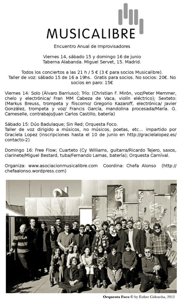 El sábado 15 de junio, además, ofrecerán un concierto con el cuarteto Sin Red dentro del Encuentro Anual de Improvisadores que, organizado por Música Libre, se celebra durante todo el fin de semana en la Taberna Alabanda (C/Miguel Servet, 15) de Madrid (ver el cartel más abajo).
