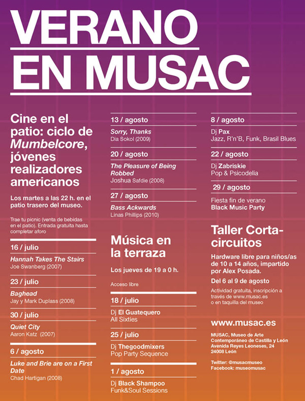 Esta semana comienza la programación veraniega del Musac, en León. Cada martes se proyectará una película al aire libre, a las 22 horas, en el patio trasero del museo. Y cada jueves habrá sesiones musicales de diferentes estilos en la explanada del museo desde las 19 a las 00 horas.