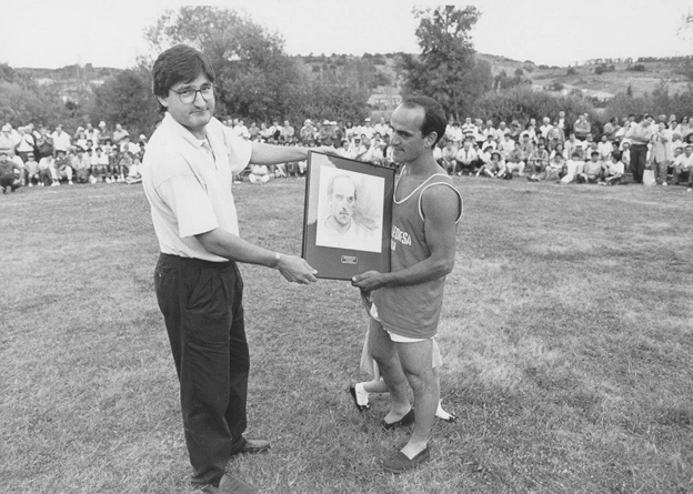 Óscar Campillo, durante su etapa como director de La Crónica, entregando un premio de lucha leonesa a Anastasio, en 1993. Fotografía: Mauricio Peña.