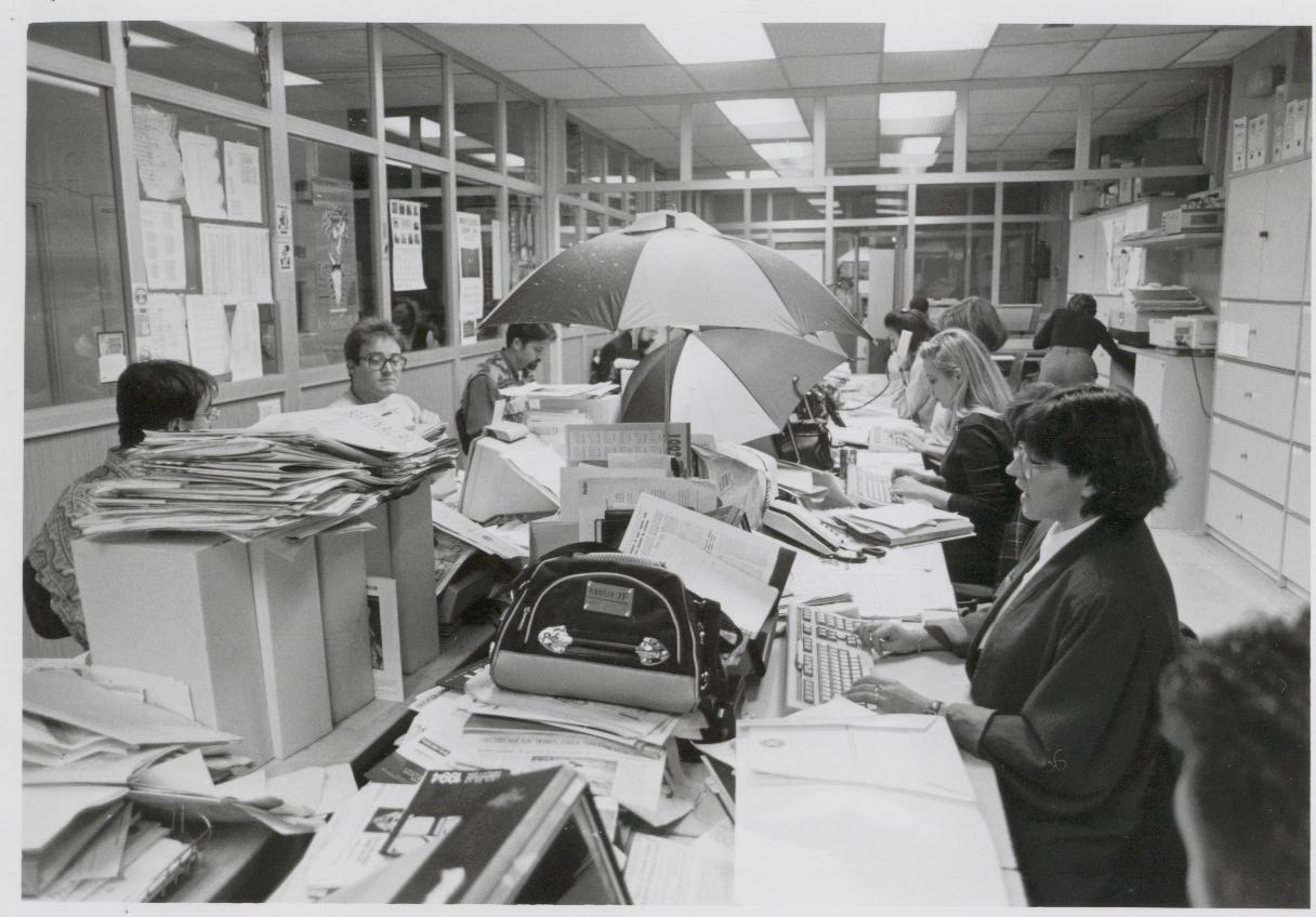 Era una oficina angosta, recién estrenada, fragmentada en peceras, con olor a plástico y tinta, de ordenadores enormes y relucientes, y gente demasiado joven, pero tan apasionada.