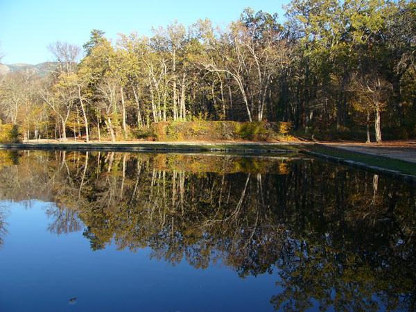 Acerquémonos despacio al estanque del Cuadrado. Hay otros de igual forma, pero éste es su mejor representante y  el más cautivador de todos. Veremos que está dispuesto en una posición girada respecto de la trama ortogonal del trazado general (no exenta de diagonales). Se muestra como una lámina perfecta, como un auténtico espejo, y como algunos medicamentos de amplio espectro, comprobaremos que produce diversas reacciones y efectos (puede que hasta secundarios). Pieza líquida con cualidades ópticas y emocionales, de efecto hipnótico y sedante. Son frecuentes los espejismos que consigue, con la aparición de vistas ilusorias e irreales al acercamos inopinadamente a él. Diseñado para manifestarse como una tersa y satinadísima lámina, se llega a mostrar en ocasiones casi sólido, de lo tirante que parece su superficie, con su membrana horizontal tensionada. En algunas ocasiones llega a ser realmente sólida, cuando hiela y se forma placa. A veces puede verse rizada por el viento o distorsionada por las ondas provocadas al arrojar unos guijos o cantillos… ¿para romperla? o salpicada de copos de nieve.
