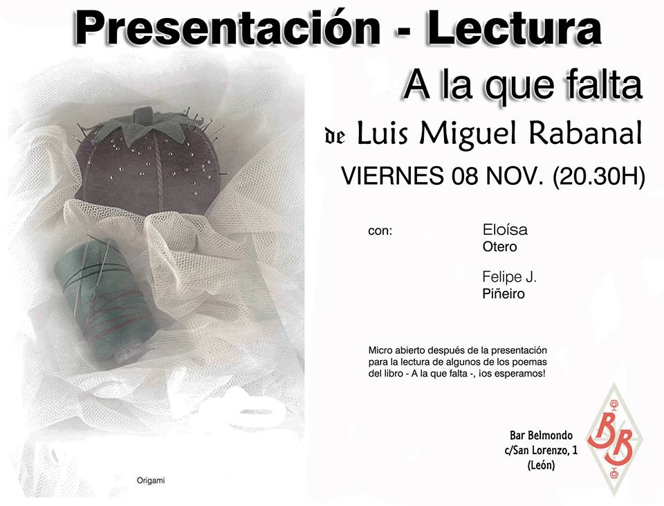 El último poemario de Luis Miguel Rabanal, ‘A la que falta’, se presenta este viernes, 8 de noviembre, en el bar Belmondo (León). En el acto, que comenzará a las 20.30 horas, intervendrán los poetas Felipe J. Piñeiro y Eloísa Otero, y después se abrirá el micro para la lectura de algunos poemas del libro por parte de los asistentes.