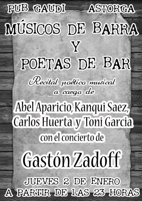 Si eres de estas últimas personas y si no lo eres con más motivo, este jueves día 2 de enero a las 23:00 te esperamos en el Pub Gaudí de Astorga (León). La poesía estará esperándote sentada pidiendo una buena canción junto a Gastón Zadoff y los poetas Carlos Huerta, Kanki Sáez, Toni García y Abel Aparicio. Seguro que la ves y quieres sumarte a la conversación. Hazlo por ti.