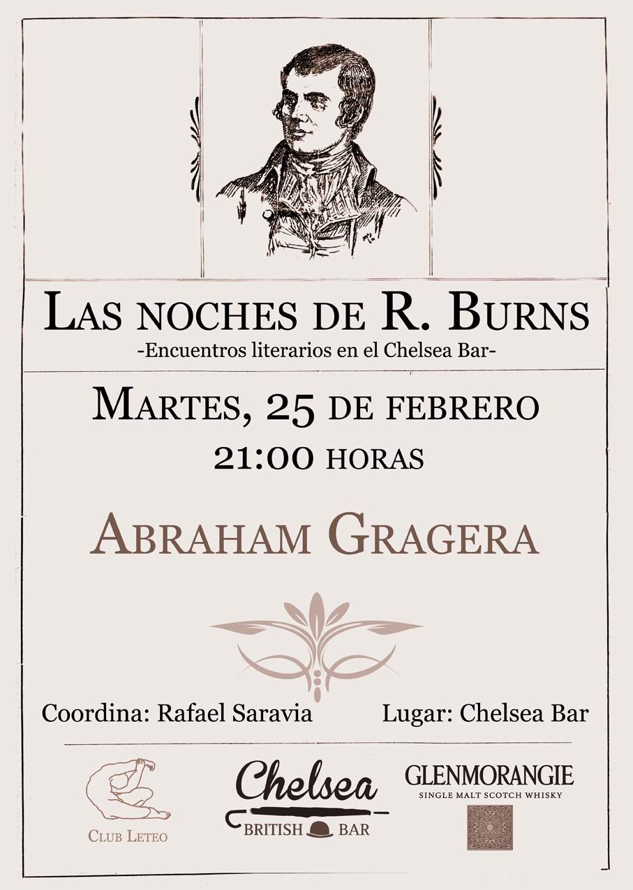 El poeta Abraham Gragera (Madrid, 1973), cuyo último libro, ‘El tiempo menos solo’ (Pre-Textos), fue galardonado recientemente con el premio Ojo Crítico de RNE de Poesía por «su voz poética, muy personal, que no duda en mostrar su compromiso moral con las precariedades actuales», participará este martes 25 de febrero en el ciclo Las Noches de R. Burns, que organizan conjuntamente en León el Bar Chelsea (C/ Varillas, 5) y el Club Leteo, coordinado por Rafael Saravia.