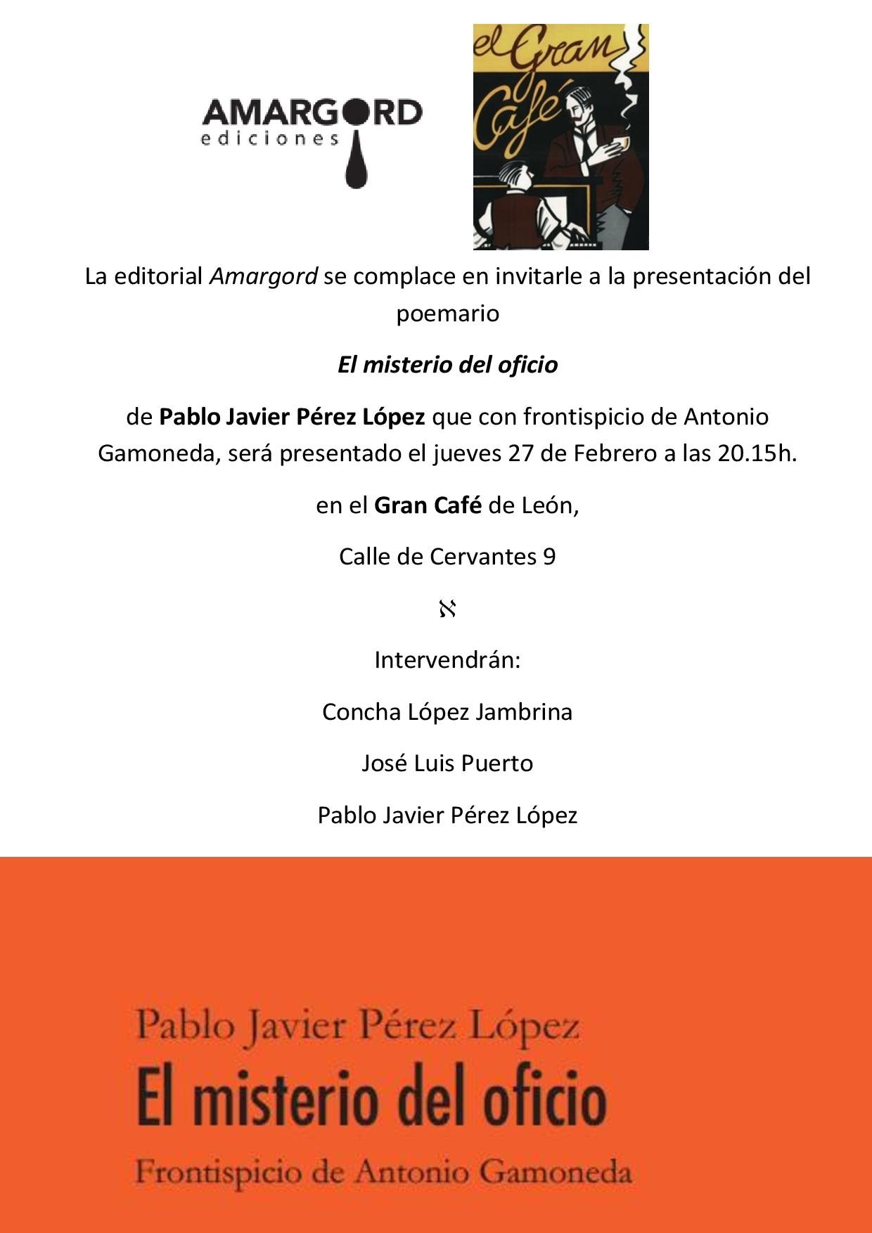 El próximo jueves 27 de febrero, el escritor vallisoletano Pablo Javier Pérez López presentará su segundo poemario, “El misterio del oficio” (editorial Amargord) en León. La presentación tendrá lugar en el Gran Café de León (calle Cervantes) a las 20.15 horas y acompañarán al autor la profesora Concha López Jambrina y el poeta salmantino afincado en León José Luis Puerto.