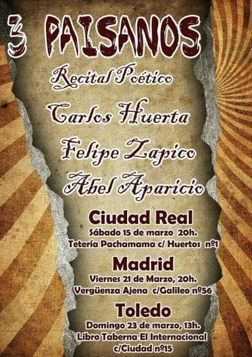 Los ‘3 Paisanos’ de San Román de la Vega (Abel Aparicio), Astorga (Carlos Huerta) y León (Felipe Zapico) son viejos conocidos en el arte de declamar a pie de calle. Aunque no era la primera vez que se veían las caras, sí estrenaron espacio común en el libro de poesía indignada ‘Esto no rima’ editado por Origami. A partir de ahí llegaría el recital poético de Stop Desahucios en las fiestas de Astorga y ahora se unen bajo el paraguas ‘3 Paisanos’, una suerte de confabulación en la que se entremezclan metafísica, rebeldía, amor, compromiso social, surrealismo, realidad, arraigo… A pesar de los lenguajes distintos en los que se manejan (música, poesía, revolución…), los tres poetas confluyen en las plazas, las calles o el bar.