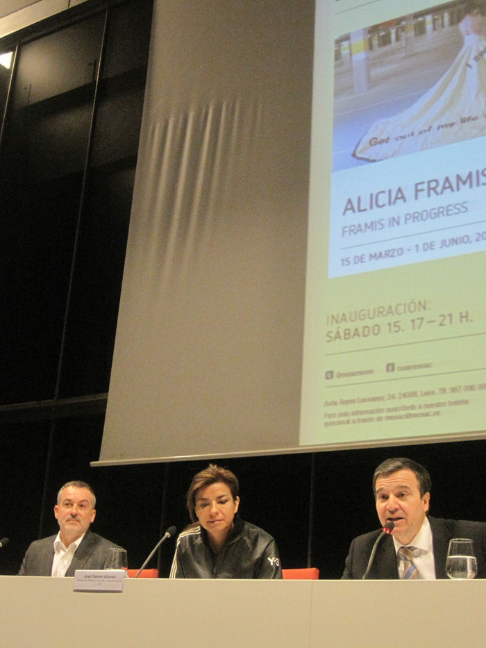 0-1-present 15 de marzo de 2014 Return to: Alicia Framis: “Mi trabajo está lleno de posibilidades para vivir de otra manera o vivir mejor”Máxima resolución (700 × 933) Image navigation Previous Image Manuel Olveira (director del Musac), Alicia Framis y José Ramón Alonso (director general de Servicios Culturales de la Junta), durante la presentación de '"Framis in progress'. © Fotografía: E. Otero.