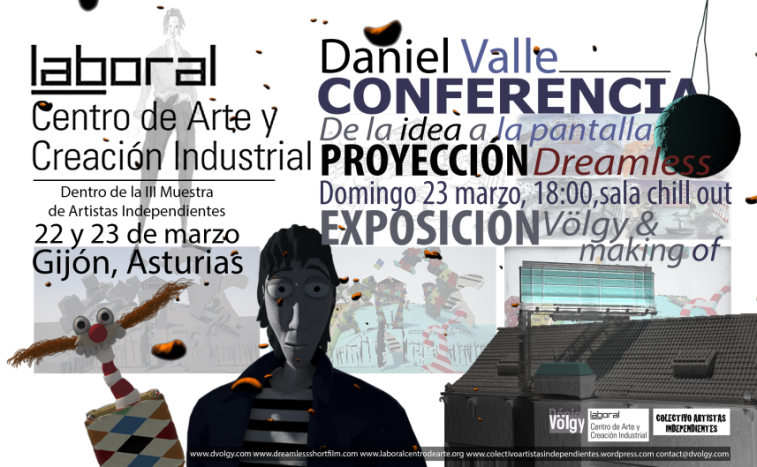 El próximo 23 de marzo Daniel Völgi ofrecerá en LaBoral, Centro de Arte y Creación de Gijón, dentro del marco de la III MUestra de Artistas Independientes, una conferencia sobre el proceso creativo. A continuación se proyectará su cortometraje «Dreamless» y se inaugurará una exposición con diseños originales de la película, el storyboard, así como distintas piezas pictóricas. Además estará a disposición del público la biblia del cortometraje, así como las distintas versiones del guión.
