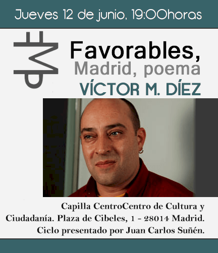 El poeta leonés Víctor M. Díez llega este jueves, 12 de junio, al ciclo de poesía contemporánea Favorables Madrid Poema que coordina Juan Carlos Suñén en el nuevo espacio cultural madrileño Centro Centro.