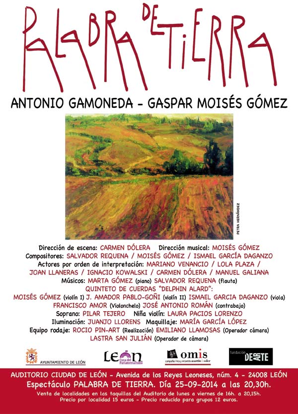 «Recitar sobre música utilizando la voz humana como un instrumento más, pero también pintar con la luz en el escenario los sentimientos de dos grandes hombres de nuestras letras». Con esa intención nace Palabra de tierra, un espectáculo inspirado en la obra de los poetas Antonio Gamoneda (Premio Cervantes 2006) y Gaspar Moisés Gómez, que se estrenará en el Auditorio de León el próximo jueves 25 de septiembre (20 horas). Ese día se convertirá en realidad un sueño pensado por dos amigos creadores: el violinista y compositor Moisés Gómez Hernández y la actriz, escritora y directora de escena Carmen Dólera. En el proyecto participan más de una veintena de personas, entre músicos, compositores, actores y técnicos.