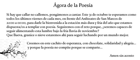 El Ateneo Varillas (León) acoge este jueves, 30 de octubre, a las ocho de la tarde, la presentación del libro «Ágora de la poesía», una publicación en la que participan 25 de los autores que, durante el último año y medio, se han dado cita en los encuentros del Ágora que se celebran, cada último viernes de mes, en el pequeño anfiteatro al aire libre ubicado en la leonesa Plaza de San Marcos. Y mañana, 31 de octubre y último viernes de mes, nueva cita poética (la nº 18 ya) a partir de las 22 horas.