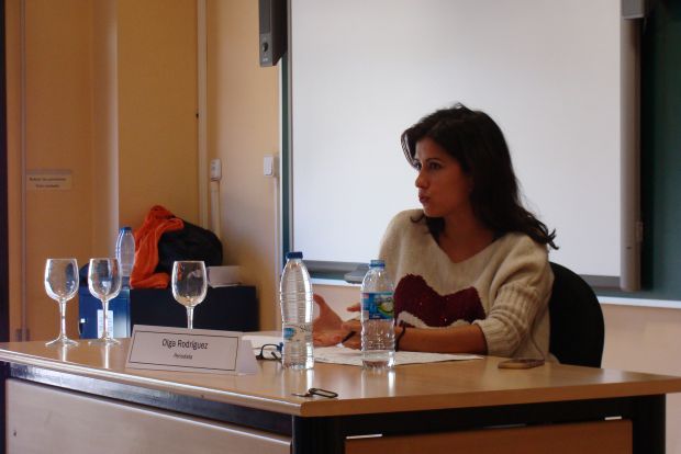 Olga Rodríguez, que habló ante un centenar de alumnos de diferentes cursos del Grado de Periodismo, les recomendó ser insistentes y apostar por esos temas que no siempre interesan. «Para ser un buen periodista hay que ser pesado», les dijo, ejemplificando con ello una experiencia personal que asistió a un desmantelamiento de las redacciones y al despido de los periodistas más comprometidos para dejar profesionales precarizados trabajando en redacciones serviles. «Tenemos que ser libres para ejercer esta profesión y eso pasa por no tener miedo ni ataduras, porque sólo así podremos denunciar la realidad», les dijo.