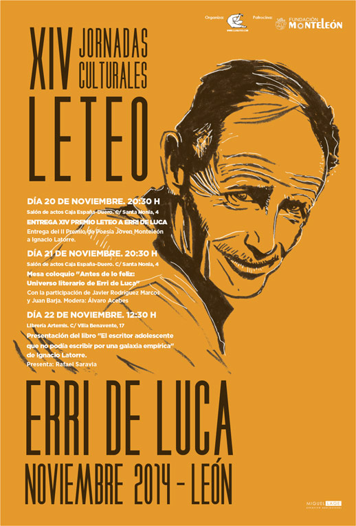 El escritor Erri de Luca recibirá este jueves 20 de noviembre, en León, el Premio Leteo 2014, en el marco de unas jornadas literarias que se celebrarán durante tres días en torno a su figura, y en las que también participarán Juan Barja (escritor y director del Círculo de Bellas Artes) y Javier Rodríguez Marcos (poeta y periodista de la sección de Cultura de El País).