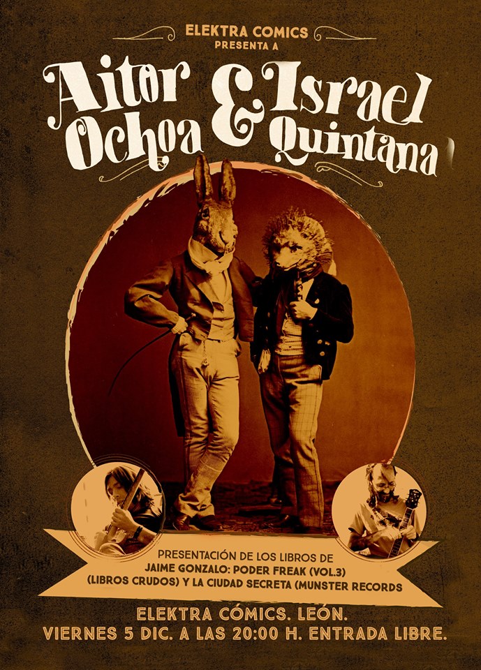 La librería Elektra Cómics (León), especializada en cómics, y también en libros y música sobre cultura pop, se suma al Festival con esta presentación doble, protagonizada por Jaime Gonzalo (Bilbao, 1957). El autor presenta el tercer volumen de la trilogía “Poder Freak”, publicada por Libros Crudos, editorial de Bilbao dedicada a la contracultura. Y “La ciudad Secreta”, apadrinada por el sello Munster Records.