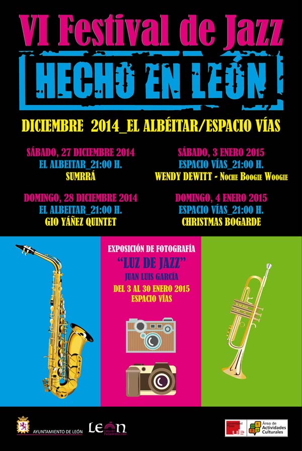 El VI Festival de Jazz ‘Hecho en León’, que arranca el próximo sábado 27 de diciembre, ocupa este año cuatro actuaciones. Las dos primeras, la del grupo gallego Sumrrá (día 27) y el guitarrista berciano Gio Yáñez, se celebrarán en el teatro El Albéitar; las otras dos, la de la cantante y pianista norteamericana de boogie-woogie Wendy Dewitt (3 de enero) y el ‘crooner’ leonés Javier Arias (4 de enero), tendrán lugar en Espacio Vías, lugar que también albergará una exposición fotográfica de Juan Luis García