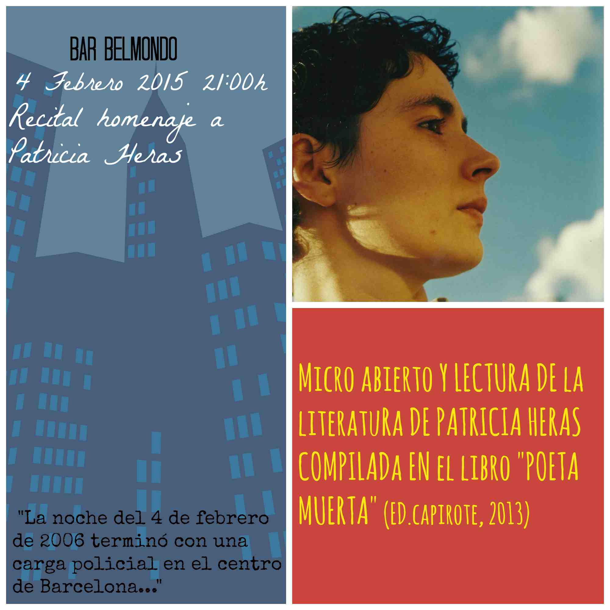 El Bar Belmondo, en León, acoge este 4 de febrero un recital homenaje a Patricia Heras, la protagonista de «Ciutat Morta», el premiado documental que Xapo Ortega y Xabier Artigas realizaron sobre el caso 4F. En el homenaje habrá micro abierto y se leerán poemas del libro póstumo de Patricia Heras, «Poeta muerta» (ed. Capirote, 2013).