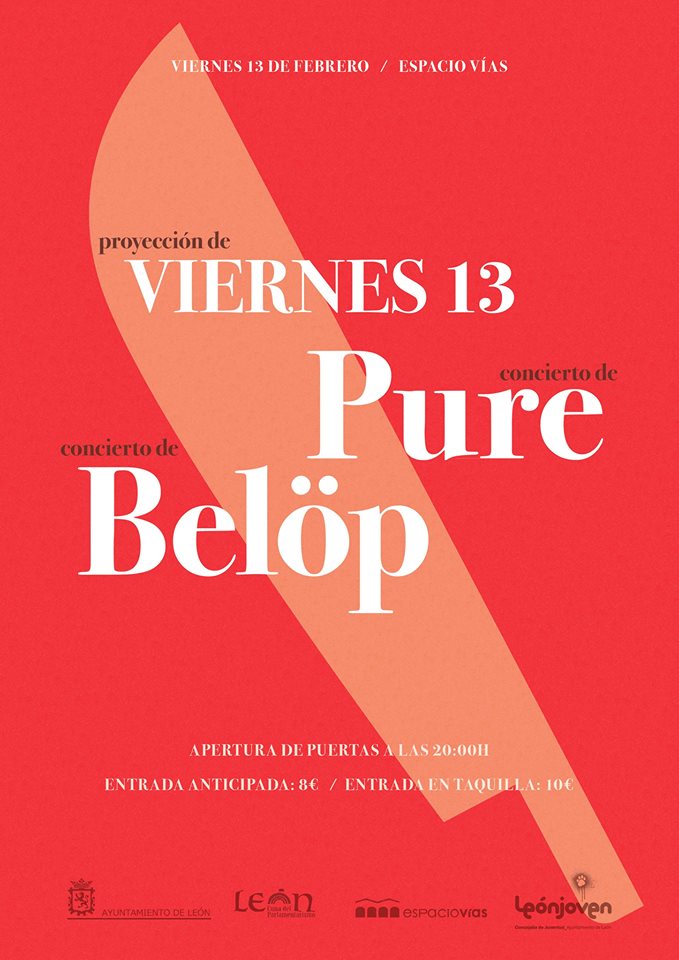 Espacio Vías, en León, celebra la llegada del Carnaval este viernes 13 de febrero con la proyección de la sangrienta “Viernes 13” y un concierto doble con los leoneses «Pure”, una de las bandas fetiche de Producciones infames (Pi) y los gallegos “Bëlop”. Cine de terror y música, en una cita organizada por el Bar Belmondo que dará comienzo a partir de las 22:00 horas.