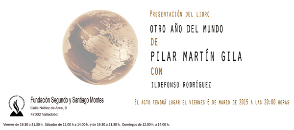 La Fundación Segundo y Santiago Montes (Valladolid) acoge este viernes 6 de marzo, a las 20 horas, la presentación del libro de poemas «Otro año del mundo», de Pilar Martín Gila. El libro está publicado por Ediciones La Palma, dentro de la colección Eme que dirige Nuria Ruiz de Viñaspre. En la presentación acompañará a la autora el poeta y músico Ildefonso Rodríguez.