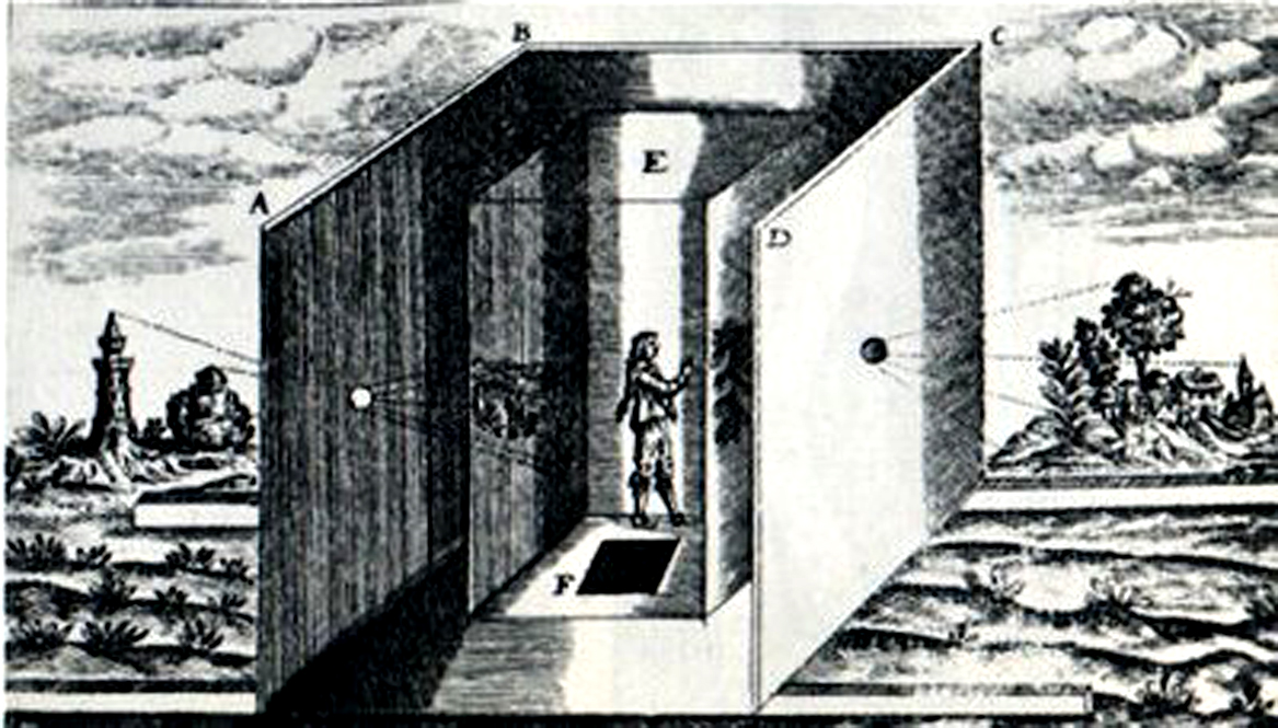 En 1420 Brunelleschi fascina con un juego de engaño, en su cuadro del Baptisterio de la Catedral de Florencia realiza un agujero cónico, justo en el punto de fuga y coloca el cuadro enfrente del Baptisterio real. El espectador debía situarse en la puerta de la Catedral y observar el Baptisterio desde ese orificio en la parte trasera de la pintura, con un espejo en la mano, de modo que lo que veía era realmente la pintura de Brunelleschi, pero quedaba persuadido de estar viendo el baptisterio real. Este efecto era mucho más realista de lo esperado, ya que al pintar el cielo con pintura metálica, las nubes reales se reflejaban y movían también en el cuadro. Para ello les hace mirar por un agujero delante del cual coloca el dibujo pero ellos creyeron estar viendo el baptisterio real. No es que el dibujo fuese exactamente igual a la realidad propiamente dicha, sino a la visión que se tiene de la realidad si la miraras por ese agujero. Esto nos llevaría a preguntarnos ¿qué es la realidad? Éste es el principio de la cámara oscura.