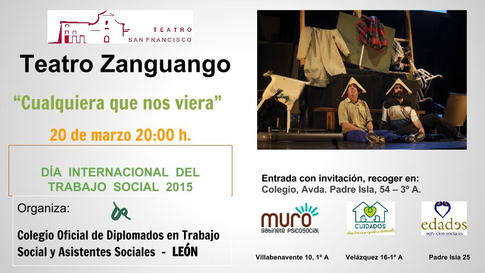 Al día siguiente, viernes 20 de marzo, el Colegio de Trabajo Social y Asistentes Sociales celebra el día Mundial de Trabajo Social con el espectáculo “Cualquiera que nos viera», de la premiada compañía Teatro Zanguango, dirigida por Miguel Muñoz Montoro, y con los actores Miguel Ángel Pérez Ávila y José Ignacio Fernández de Jaúregui sobre el escenario. Para asistir a la representación, que comenzará a las 20 horas, hay que recoger la invitación en la sede del Colegio (C/Padre Isla 54, 3ºA).