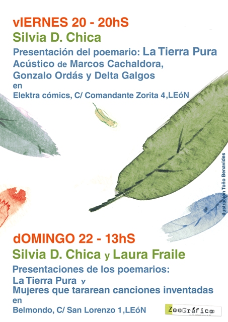 Editora del fancine Vinalia Trippers, ilustradora, fotógrafa y escritora, la leonesa Silvia D.Chica presenta este viernes 20 de marzo, en la librería Elektra Cómics León, su primer libro, “La Tierra Pura”. Un poemario publicado por Zoográfico Diseño Editorial, con ilustraciones y portada de Toño Benavides y prólogo de Ana Pérez Cañamares. A la presentación se suma un acústico de Marcos Cachaldora, Gonzalo Ordás y Delta Galgos. Y el domingo, 22 de marzo, en sesión vemouth, lectura compartida con la periodista y poeta vallisoletana Laura Fraile en el Café Belmondo.