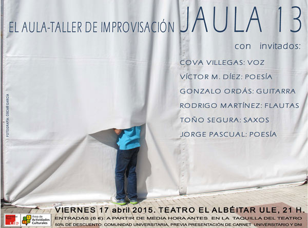 Los músicos improvisadores de Jaula 13, capitaneados por Ildefonso Rodríguez, ofrecerán un concierto el viernes 17 de abril en el teatro El Albéitar, a las 21 horas, dentro de la programación del Área de Actividades Culturales de la Universidad de León. Para la ocasión han invitado a acompañarles a cuatro músicos amigos —Cova Villegas, Gonzalo Ordás, Rodrigo Martínez y Toño Segura— y a los poetas Víctor M. Díez y Jorge Pascual.