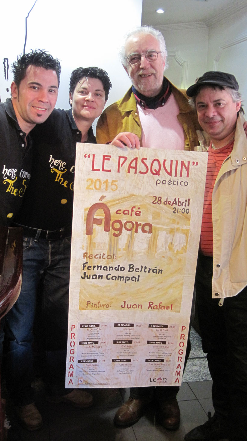 Tras la inauguración el lunes 27 de abril de «Le Pasquín» con un Tendedero poético a cargo de Ángeles Rodríguez, el martes 28 de abril tendrá lugar el primer recital propiamente dicho del programa organizado por la Concejalía de Cultura de León. Será en el café Ágora donde el poeta asturiano Fernando Beltrán y el leonés Juan Campal leerán sus poemas en un acto que comenzará a las nueve de la noche y durante el cual, además, el artista plástico Juan Rafael (alias Rafa Murciego) realizará una intervención pictórica en directo, personalizando los distintos carteles del programa.