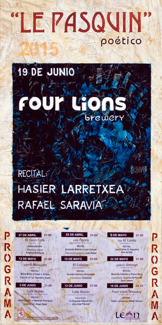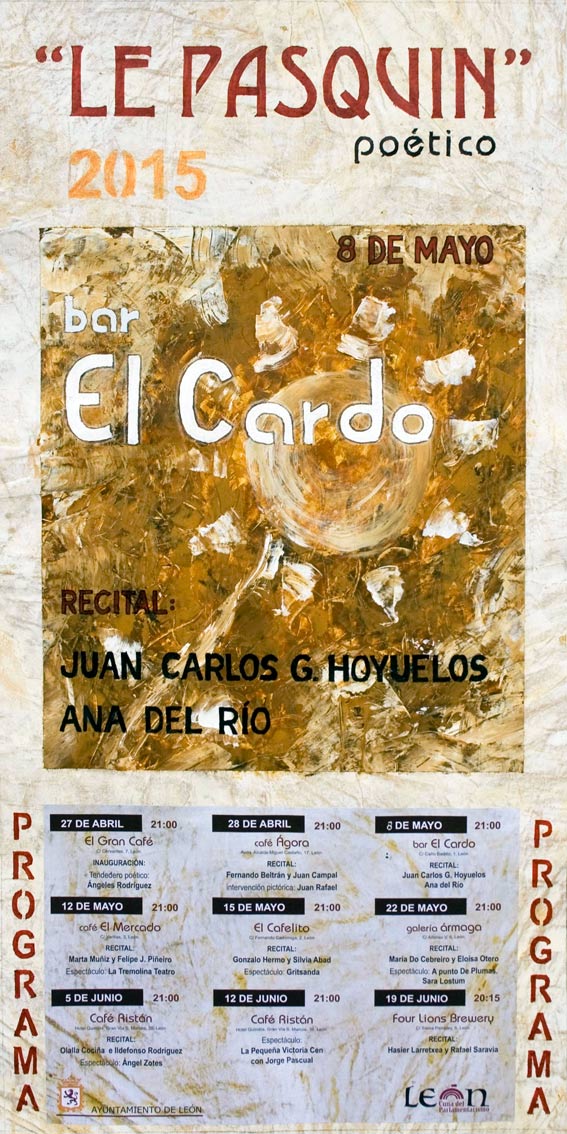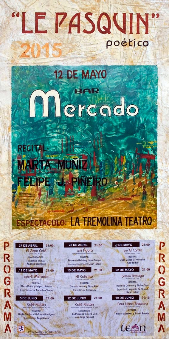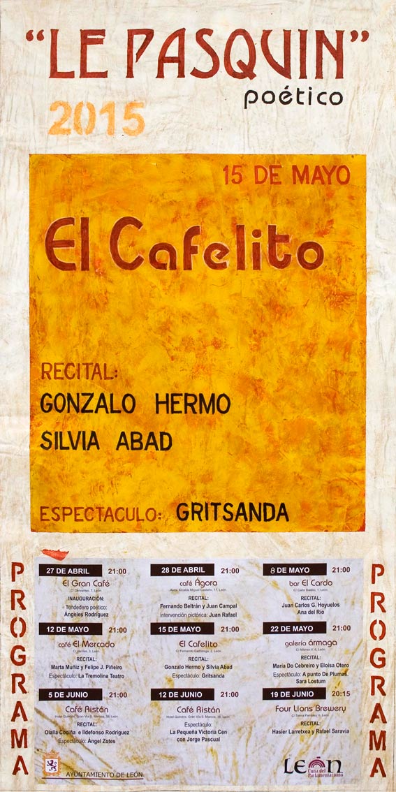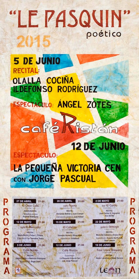 Aquí se pueden ver todos los carteles de «Le Pasquín 2015», realizados por el artista leonés Juan Rafael sobre papel reciclado a mano. Los carteles forman parte del programa poético que, organizado por la Concejalía de Cultura de León, arrancó el pasado 27 de abril y continuará desarrollándose hasta finales de junio. Semana a semana recitarán en total 16 poetas, en dúos, en distintos establecimientos y cafés de la ciudad. Participan también en este ciclo, acompañando a los poetas, cinco pequeñas compañías de artes escénicas (teatro sensorial, danza, circo, teatro y música representada).