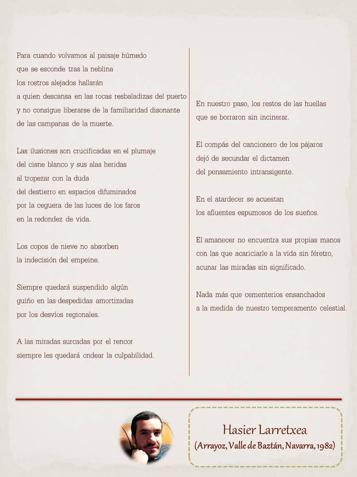 hasier 17 de junio de 2015 Return to: «Le Pasquín 2015» / Recital de Hasier Larretxea y Rafael Saravia, con el «aizkolari» Patxi LarretxeaMáxima resolución (720 × 960) Image navigation Previous Image Siguiente imagen Poema de Hasier Larretxea maquetado por Ángeles Rodríguez para el "Tendedero poético" de Le Pasquín 2015.