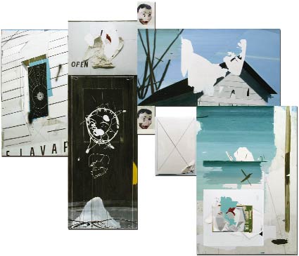 Si continuamos el paseo, hacia la derecha de este cuadro, podemos contemplar los EXTERIORES de distintas viviendas, Sala 2. La primera es una casa con raíces dibujada en rojo con escarcha de poliéster por Xavi Muñoz, una ensoñación del lugar estable, la casa como la piel del hogar. A continuación una serie de miradas fotográficas de La costa, tomadas por Rubén Acosta, que contienen detalles de diferentes viviendas tomadas en una población del litoral. La casa fragmentada, bien como cúmulo de distintas viviendas o bien como observaciones parciales de una misma se traducen en diferentes cuadros formando un políptico de Rubén Guerrero, en este existe un regusto a nostalgia y recuerdo, a pensamientos extraviados o a presencias fantasmales (pero de las que no dan miedo).