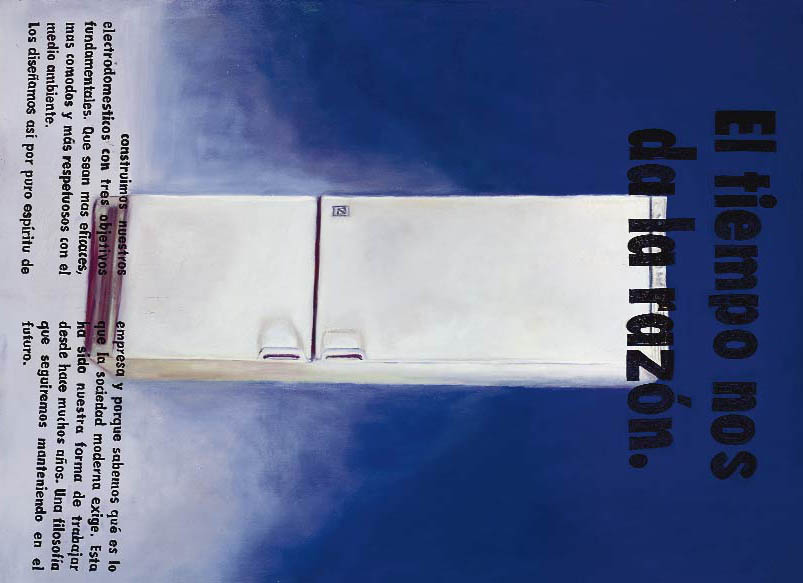 Una botella de Portikus water. From the source of a well by drill como objeto apropiado de Jason Rhoades y Hugh Pocock exhibe agua selecta como obra de arte. El frigorífico preside la cocina del DA2, no obstante esta tumbado, además de estar pintado por Victoria Gil a partir de un anuncio, representación de la muestra de un deseo que, a su vez, contiene otros frescos. Dos cuadros con manchas marrones de Emilia Azcárate, uno con la serie ordenada y otra con un orden algo desmadejado puede llevarnos a rememorar los papeles sobre los que se pone la masa del pan hasta salpicaduras de grasa. Incluso podrían ser las de la escultura de Olga Adelantado que aparenta una masa de mantequilla, de esa que se cuajaba directamente a partir de la leche de la vaca. Y salimos de la sala tras contemplar dos fotografías, Casas Habitadas de Rita Magalhães, con una mujer de espaldas en dos momentos de espera, quizás tras haber preparado la comida.