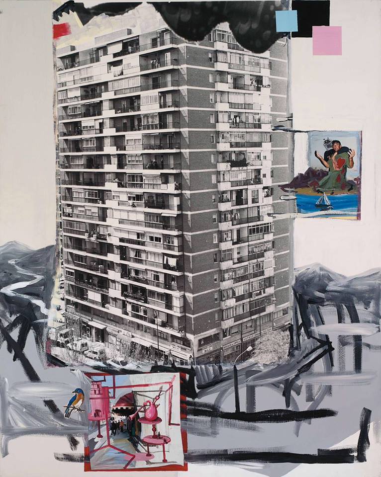 Atravesando la sala nos encontramos con una minúscula casa, Atelier, suficientemente grande como para no ser una maqueta y sobre la que David Escanilla ha acomodado formas geométricas a través de cortes, pintura y luz negra. También sobre el suelo de la sala aparece un perro, una escultura de José Noguero, a la expectativa y vigilante de lo que pueda provenir del otro lado de la ventana. Cerrando la visión exterior un edificio de pisos en un barrio cualquiera y en el que confluyen simultáneamente diferentes historias particulares, como en la Rue 13 del Percebe, son representadas a través de la intervención pictórica sobre fotografía de Juan Ugalde, Amor en la ciudad. Y, como suele suceder en todas las ciudades, alrededor de las colmenas de pisos en los barrios aparecen distintos ejemplos de chabolismo que reconstruye Santiago Mayo como pintura objetual.