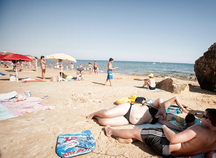 El absoluto de la luz en la planicie, nos reseca la boca. Invocación a Junichiro Tanizaki: lo tenue, el contraluz, la semipenumbra… Elogio de la sombra. Quien mira, busca el abrigo de las rocas, la sagrada arquitectura del chiringuito. Y la larga línea de los cánticos oferentes hacen coctelera en el oído: “Ais crim, bombones helados, glass”; sandías, cervezas, masajes, collares, refrescos.