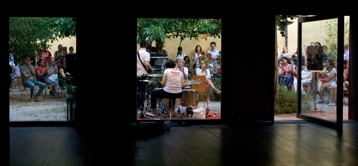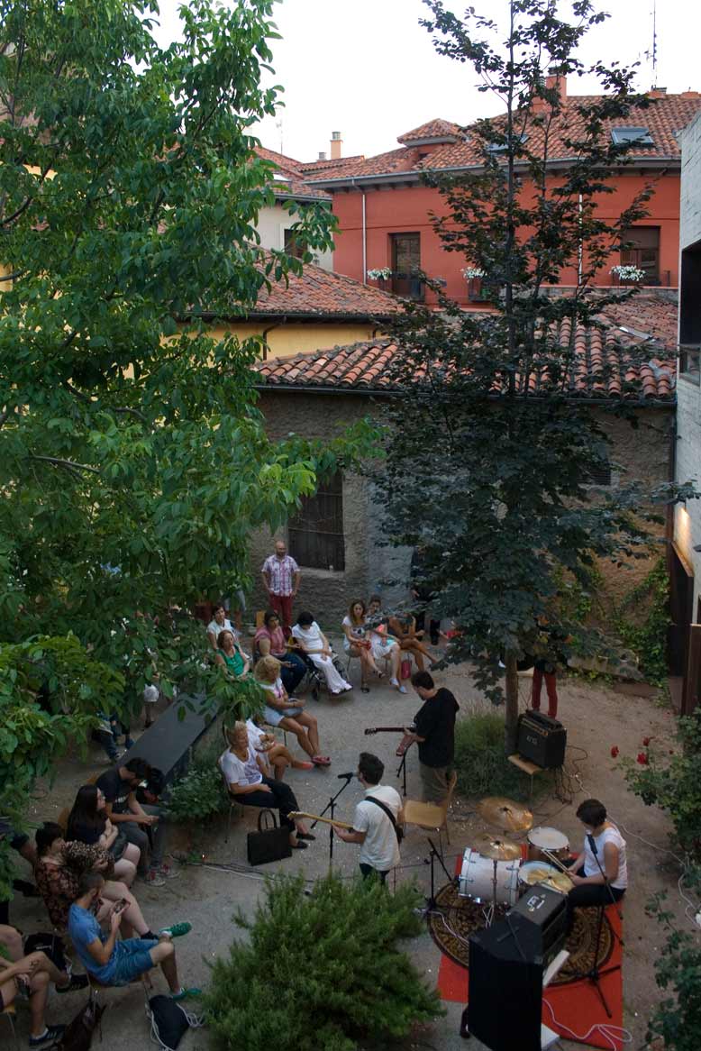 Eso pensaba también la baterista, Reyes Paramio, quien al finalizar el concierto animaba equivocadamente así a la gente: «No os vayáis, que ahora hay una sesión de Dj’s». Ojalá. Pero no. No hay más. Y da pena marcharse, la verdad, porque se está requetebién aquí, mientras cae la tarde. Así que mientras el equipo de Pi recoge las sillas y los aparatos aprovecho para preguntarle a Ángel Román y a los amigos y arquitectos que le acompañan por algunos detalles de este patio.