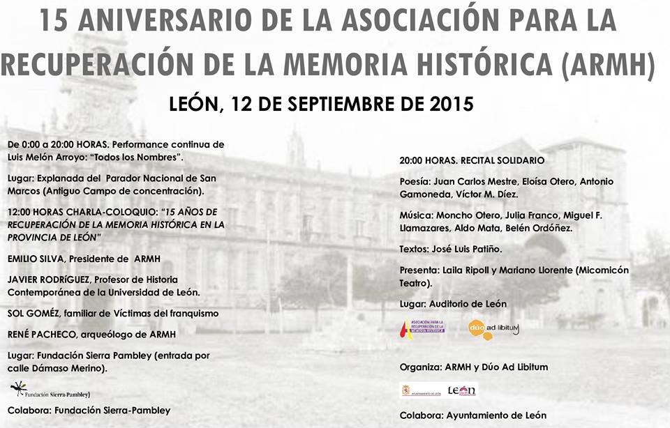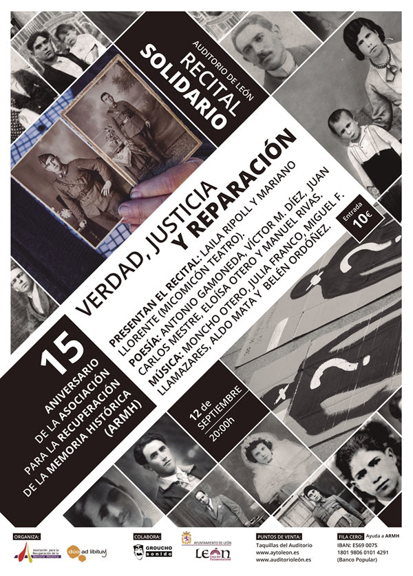Con motivo del 15 aniversario de la creación de la Asociación para la Recuperación de la Memoria Histórica (ARMH), el Auditorio de León acogerá el próximo 12 de septiembre, a las 20 horas, un recital solidario bajo el lema de «Verdad, Justicia y Reparación».