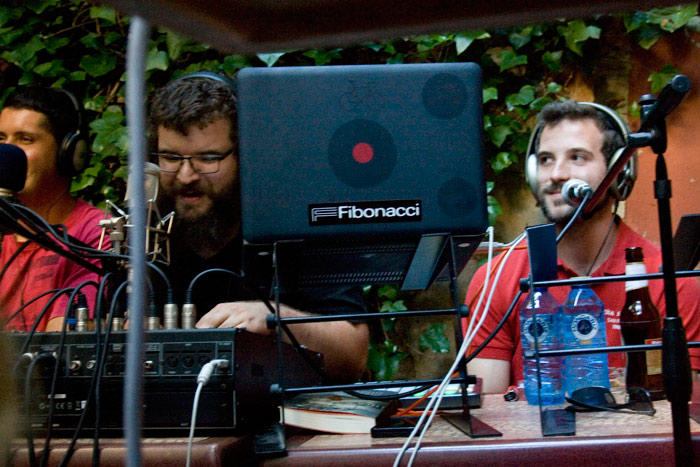 La enredadera que cubre el patio me recordaba a la que había antaño en mi fachada, y aquí sirve de escenario para técnicos y artistas sobre la pared de ladrillos del fondo. La rigurosa puntualidad de Pi se retrasa levemente, al pasar las siete de la tarde, mientras terminan de llegar los invitados al programa. Ya estamos todos. Últimos ajustes de posición de micrófonos y cascos, y Cubo Radio presenta el penúltimo programa de su primera temporada. Para quienes no sepan qué es esto de Cubo Radio, les diré que es la iniciativa surgida de manos de Genzo, Rompe y Pedro, como un deseo de buscar la radio pura en directo teñida de charlas enriquecedoras, y cuyo objetivo principal no es otro que el de la instigación y la transmisión de cultura y arte, su difusión y su movimiento. Cubo Radio es, como ya habrán deducido, un programa de radio.