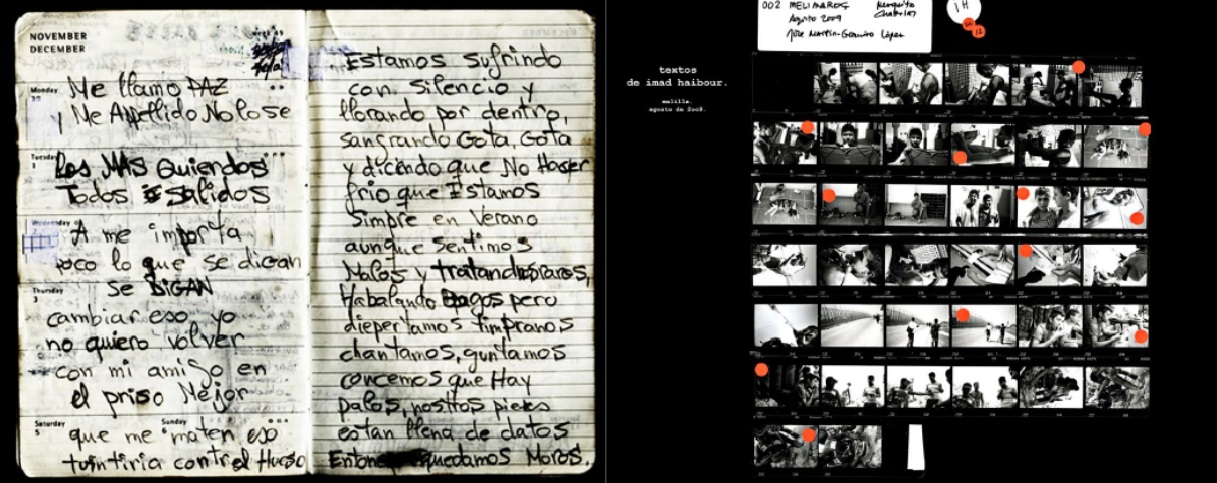 Dos instantáneas aéreas describen de modo un tanto tenebroso la llegada del autor a Marruecos y sitúan al lector en un territorio fronterizo. Estas imágenes en color darán paso al blanco y negro de duros contrastes que impera en la primera parte. Imad y sus diarios, la arquitectura industrial y decadente de Melilla y Tánger, el “barrio chino” y los refugios de la marginalidad o los internos del centro de menores La Purísima conforman los motivos de estas primeras fotografías. Lejos del naturalismo al que es proclive la radiografía de los desheredados, el propósito de crítica social se encarrila por un lenguaje que invoca un expresionismo de vanguardia. En los grandes espacios urbanizados, consigue con juegos de luces y sombras conferir la estampa de una ciudad degradada, víctima del óxido y la hiel. Sus fotografías nocturnas, entre lo onírico y lo apocalíptico, lindan con la abstracción. En las páginas con los apuntes de los diarios de Imad propone mediante la composición a doble página un diálogo entre el lenguaje escrito y los negativos con sus renglones de imágenes, como si estas también fueran palabras sueltas o pensamientos atrapados al vuelo. En los retratos, tomados con nervio e incluso frenesí, se eleva como un maestro de la captura del modelo en movimiento. Estos instantes rebosantes de vitalismo e intensidad reflejan con puridad la constante lucha por la supervivencia que distingue a los condenados a la exclusión y la clandestinidad.