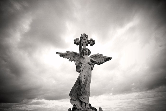 No se atreven a abrir los ojos, los vigilantes del cielo, por miedo a ver a su dios. Y por temor a la impudicia del sexo del que carecen, cubren sus pies. De espaldas al mar y al cielo, elevan su mano como un cantaor sin nadie, para decir a los finados: Yo soy símbolo de lo invisible, de las fuerzas que ascienden y descienden entre el origen y la manifestación (Cirlot).