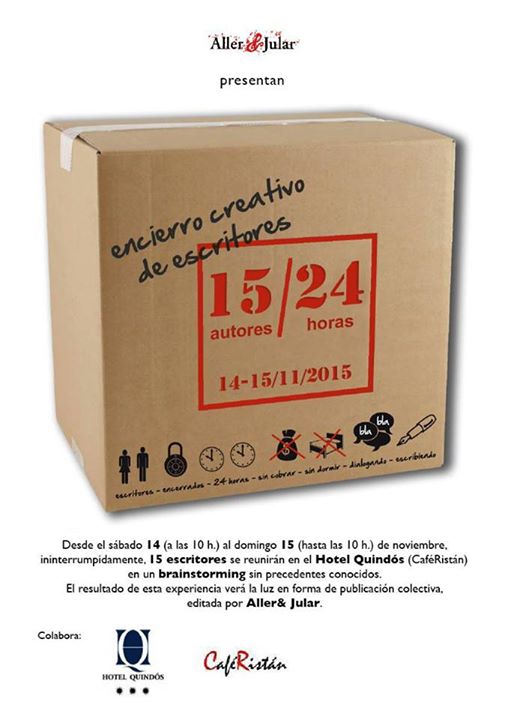 El colectivo Aller & Jular (detrás del cual se encuentran la editora Ana R. Jular y el ilustrador y creador multifacético Nacho Aller) ha invitado a 15 escritores leoneses a participar en un experimento de «brainstorming» sin precedentes. Los autores se reunirán durante 24 horas ininterrumpidas en un hotel de la capital leonesa (en el Café Ristán del hotel Quindós), y el resultado de su experiencia creativa-colectiva verá la luz en una publicación. Será los días 14 y 15 de noviembre.