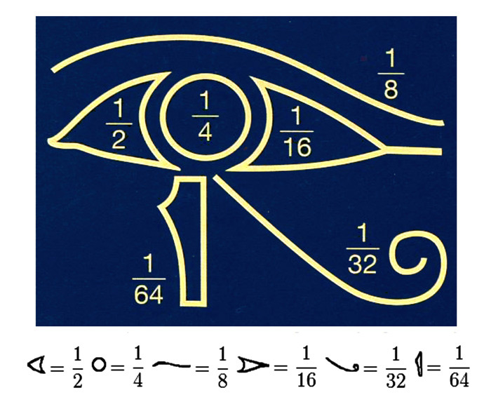 Las fracciones del ojo de Horus eran cada una de las partes en las que éste fue seccionado durante la batalla y se representaban mediante una grafía: la esquina interior era ½, el iris ¼, la ceja 1/8, la esquina exterior 1/16, mientras que los ornamentos debajo del ojo continuaban la secuencia 1/32, 1/64, …