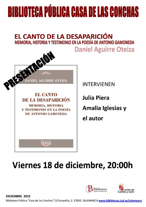 La biblioteca pública de la Casa de las Conchas, en Salamanca, acoge este viernes 18 de diciembre, a las 20 horas y con entrada libre, la presentación del libro «El canto de la desaparición. Memoria, historia y testimonio en la poesía de Antonio Gamoneda», de Daniel Aguirre Oteiza. Acompañarán al autor las poetas Amalia Iglesias y Julia Piera —autoras del guión de la película documental «Antonio Gamoneda: escritura y alquimia», una coproducción hispano-argentina realizada por Enrique Corti y César Rendueles en 2007—.