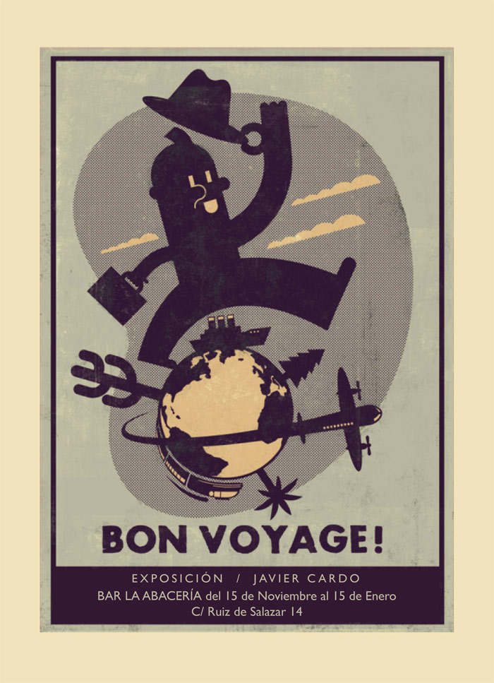 «Bon voyage». Así se titula la exposición de obra gráfica que el artista leonés Javier Cardo muestra en el bar La Abacería (León). Hasta el 15 de enero se podrán contemplar algunas de sus últimas obras, junto a otras más conocidas, en ediciones limitadas. Son en total más de una veintena de estampas digitales inspiradas en el cómic y la gráfica publicitaria de las primeras décadas del siglo XX.