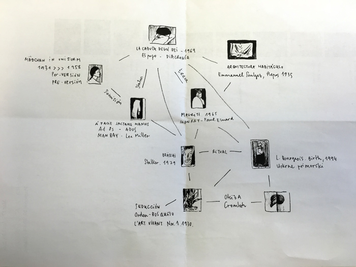 Desde la película de los años treinta, Muchachas de uniforme (Mädchen in uniform, 1931) a La caída de los dioses (La caduta degli dei, 1969) y de ahí a los dibujos étnicos de Louise Bourgeois, las fotos surrealistas de Man Ray o la fascinación por las máscaras de Brassaï, son algunas de las referencias presentes en la original hoja de sala garabateada a mano por el propio pintor y que ayuda a decodificar los misterios que encierran estos nueve magníficos cuadros. Cada una de estas referencias ejerce como punto de partida concreto para el pensamiento abstracto del que habla el título de la muestra, que abarca temas como la sumisión, el error, la seducción o los rituales.