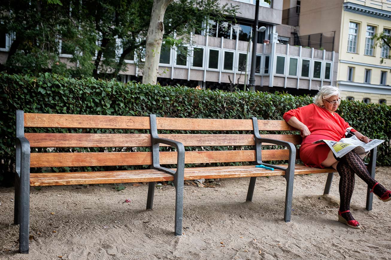 Me gusta lo que dice. Domingo, deseo y descanso. Menudas tres dés para un banco. El interés por la lectura propia y el desinterés por la ajena. La mujer de rojo no va a estar ahí, como una aparición, para la mirada del bobo de la gabardina que la ve y suena una de Steve Wonder. La mujer de rojo se ha arreglado para gozar el día sin estridencias. El conjunto es vaporoso, las medias de encaje, las cuñas de esparto, abiertas y a juego. No he quedado con nadie que no sea el propio día. Suena Perfect day de Lou Reed: ‘Es un día perfecto./ Me has hecho olvidarme de mí mismo/ Creí que era otra persona/ Una buena persona’. Gracias.