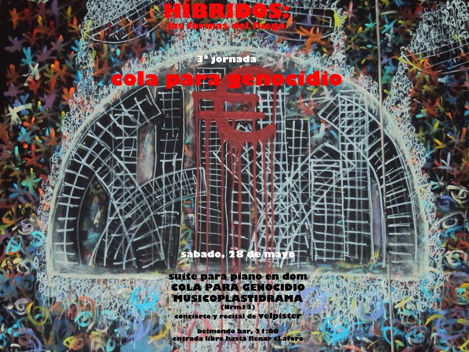 Según apunta el propio autor: «Interpretaré íntegramente la suite para piano en do menor “cola para genocidio”. Se trata de una colección de seis piezas para piano solo que se acompañan de un texto que se puede leer en la pantalla o que es declamado a lo largo de la pieza. Las imágenes, la música y el texto están perfectamente ensambladas para hacer un todo, al igual que la suite en su conjunto. La duración aproximada es de media hora. Después interpretaré una serie de piezas musicoplastidramáticas para completar el espectáculo.»