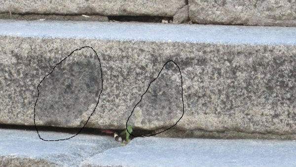 Dentro de esos granitos podemos observar manchas oscuras; alguno pensará que es suciedad del tránsito de viandantes y de vehículos y, en muchos casos no se equivocarán. Pero si prestamos atención, podemos ver que esos borrones encajan a la perfección con la roca que lo envuelve; tienen una forma definida, en la mayoría de los casos ovalada, y se llaman enclaves. Estas máculas se formaron a la vez que el granito que las contiene pero tienen una composición diferente. En concreto, tienen menor cantidad de cuarzo y mayor cantidad de minerales oscuros, de ahí su tonalidad.