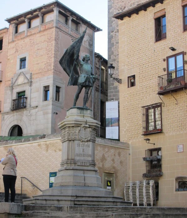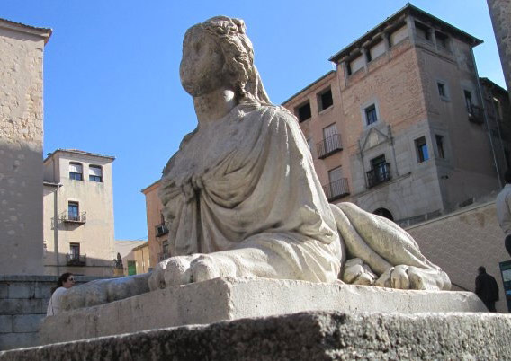 En 1850, el Ayuntamiento de Segovia encarga al artista Francisco Bellver la confección de dos sirenas, dos farolas y la fuente que se presenta al ascender por la escalinata. No se sabe si por desconocimiento del aspecto de una sirena, en 1852 esta plaza queda custodiada por dos esfinges, ambas esculpidas en roca caliza bioclástica de color blanquecino.