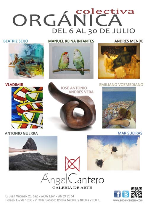 La actividad expositiva en León no cierra por vacaciones. Durante todo el mes de julio se podrá contemplar la última exposición de la temporada en la galería de arte Ángel Cantero (León), una muestra colectiva y multidisciplinar titulada “Colectiva orgánica”, en la que participan ocho artistas españoles: Antonio Guerra, Beatriz Seijo, Emiliano Vozmediano, Manuel Reina Infantes, Vladimir González Menéndez, Mar Sueiras, Andrés Mende y José Antonio Andrés Vera.